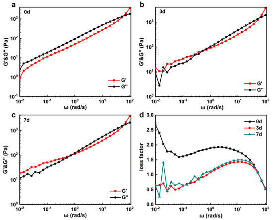 Angular frequency-dependent rheological data of MCC solutions underwent different pre-gelation durations. (a–c) Angular frequency-dependent rheological data at 0d, 3d, and 7d, respectively. (d) Angular frequency-loss factor curves at different pre-gel times.
