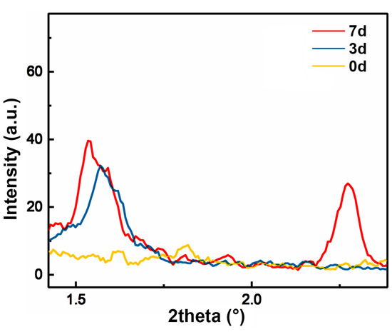 To further investigate the gelation behavior of cellulose, SAXS was employed to analyze cellulose solutions before and after pre-gelation for 3 days and 7 days, and the corresponding solvent-subtracted scattering profiles are plotted in Figure 4. Initially, the MCC solution without pre-gelation treatment shows no visible diffraction peak, indicating a lack of ordered structures in the cellulose solution. However, after 3 days of pre-gelation treatment at 60 °C, a scattering peak at 2 θ = 1.6° emerges in the SAXS pattern. This peak suggests the formation of some long-range (d~5.5 nm) ordered structures within the cellulose solution. This peak became more pronounced after 7 days of pre-gelation, and an additional peak at 2 θ = 2.3° (d~3.8 nm) was observed, suggesting further structural organization and aggregation of cellulose chains. Those structural changes suggest that over time, the cellulose chains in the solution might assemble together and organize into ordered aggregates during pre-gelation at 60 °C. These ordered structures are likely due to increased chain interactions and network formation among cellulose chains, which are facilitated by the pre-gelation process. A longer pre-gelation time leads to more aggregation and ordering of cellulose chains. These structural changes could potentially lead to improved mechanical properties and orientation in the resulting regenerated cellulose.