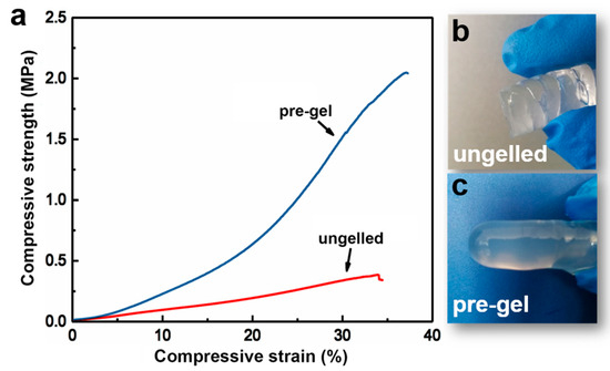 (a) Stress–strain curves of cellulose hydrogels. (b,c) Photographs of ungelled cellulose hydrogel and pre-gel cellulose hydrogel, respectively.