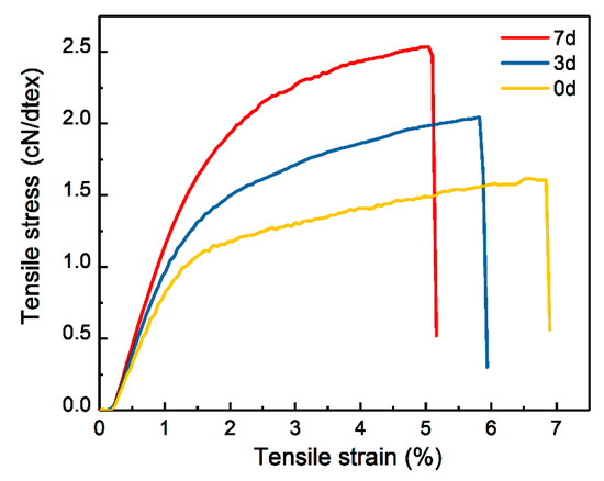 The cellulose solutions with and without pre-gelation were spun into fibers. The typical tensile stress–strain curves of G0, G3, and G7 cellulose fibers are shown in Figure 7. The detailed data are summarized in Table S1 in ESI. As the duration of pre-gelation of the cellulose solution increases, both the Young’s modulus and tensile strength of the regenerated cellulose fibers significantly improve, although the breaking strain decreases slightly. Specifically, the mechanical properties of the fibers increase by 30% after 3 days of pre-gelation but only see an additional 10% improvement from 4 to 7 days. Notably, when the gelation time extends to 14 days, the spinnability of the cellulose solution diminishes.