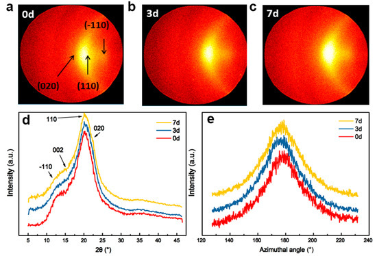 WAXD patterns of (a) G0, (b) G3, and (c) G7 fibers, (d) radial scanning curves, and (e) azimuthal scans of (110) plane.