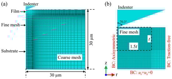 Figure 1a shows the geometry and mesh of a two-dimensional (2D) axisymmetric nanoindentation model built by the commercial software ABAQUS 2022. The FE simulation in this study was implemented based on the static equilibrium equation inside ABAQUS/CAE, and an incremental–iterative method based on the Newton–Raphson method was adopted to solve the non-behavior equations. A 2D model was used instead of a 3D model to enhance computational efficiency, since the simulation results of the 2D model have been proven to be consistent with those of the 3D model [45]. An asymmetrical conical indenter with a half-angle of 70.3° was built to be equivalent to the Berkovich indenter, which can be modeled as a rigid body due to the elastic modulus (1141 GPa) of the indenter being far greater than that of AlCu films. The surface-to-surface contact type was used, and the contact between the indenter and the film was assumed to be frictionless, as the influence of friction on the F-h curves can be neglected [46].