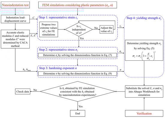 Currently, the accuracy of the proposed method is significantly dependent on the measurement accuracy of residual depth, which can be improved by constructing dimensionless functions based on the energy theory. In addition, the proposed method is limited by the constitutive model, which is a common limitation of the indentation reversed method, since power-law equations may not describe many stress–strain curves well. In the future, the automatic acquisition of material parameters with the combination of nanoindentation and finite element simulation methods based on algorithm optimization, especially an artificial intelligence technique, will be further developed, which can greatly improve the reverse efficiency of material parameters and help break through the limitations of power–law equations.