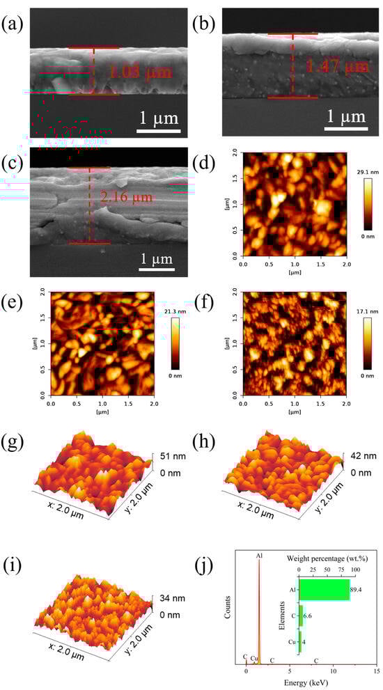 The microstructural characterization of AlCu films with different thicknesses: SEM images of the cross-section for (a) 1 µm, (b) 1.5 µm and (c) 2 µm films; AFM images of surface topography for (d) 1 µm, (e) 1.5 µm and (f) 2 µm films; the roughness profile of surface topography for (g) 1 µm, (h) 1.5 µm and (i) 2 µm films; and (j) EDS spectra.