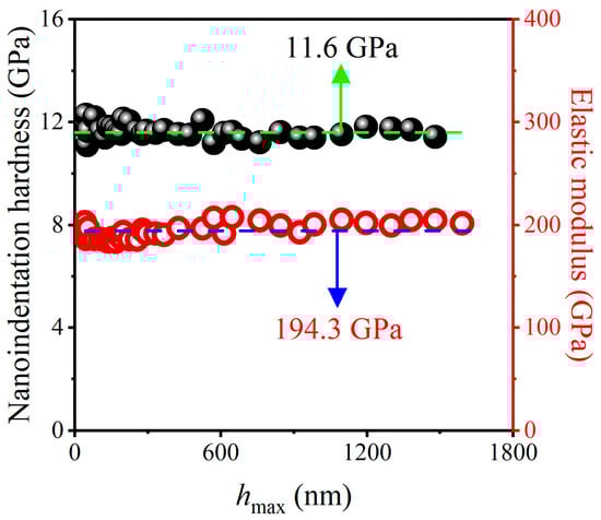 Nanoindentation tests were also performed on Si substrates, which can provide the baseline data for the AlCu/Si system. Figure 4 shows the variation in nanoindentation hardness HIT and elastic modulus EIT of the Si (111) substrate with the maximum indentation depth hmax, and the Poisson ratios of 0.18 were used for Si (111) [51]. The HIT and EIT of Si (111) substrate exhibited an approximately constant value between the maximum indentation depth hmax of 0 and 1800 nm. The average nanoindentation hardness value of 11.6 GPa was obtained, which is close to the 11.8 GPa reported in the literature [52]. The average elastic modulus value of 194.3 GPa was determined, which is almost the same as the 193 GPa obtained by nanoindentation tests [53].
