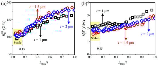 Figure 5 shows the variations in elastic modulus and indentation hardness calculated by the OP method (i.e., Equations (2) and (3)) with relative indentation depths hmax/t. Under small hmax/t (<0.15), and exhibit a stable platform, while the average values of (i.e., 99.8 GPa, 110.4 GPa and 101.5 GPa for t = 1 µm, 1.5 µm and 2 µm films, respectively) and (i.e., 2.18 GPa, 1.70 GPa and 1.87 GPa for t = 1 µm, 1.5 µm and 2 µm films, respectively) within the stable platform are significantly larger than the reasonable ranges of the similar films (e.g., for elastic modulus, Al-(0.5 wt.%) Cu films are 40–59 GPa [36,37,54], Al films are 23–64 GPa [55,56,57,58]; for hardness, Al-(0.5 wt.%) Cu films are 0.17–0.25 GPa [59], Al films is 0.4–0.8 GPa for [60]), which is attributed to the OP method, which does not consider the effect of pile-up behavior, see Figure 6, on evaluated material properties [61]. Under large hmax/t (>0.15), and increase with increasing hmax/t, which can be explained by the substrate effects [62].