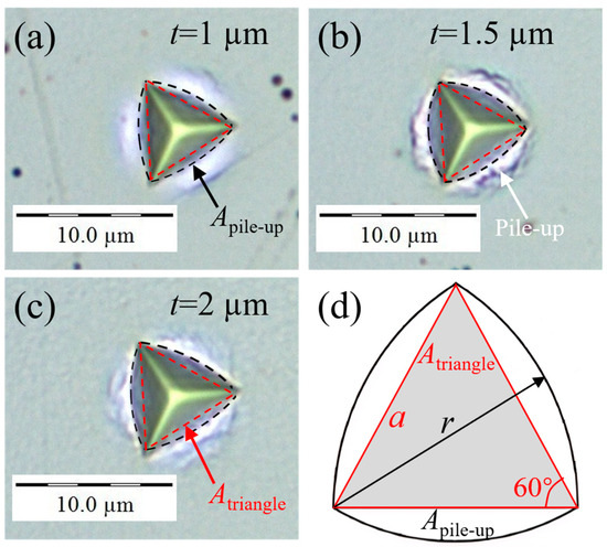 Optical images of residual imprints of AlCu films with different thicknesses under applied load of 50 mN: (a) 1 µm, (b) 1.5 µm, and (c) 2 µm; (d) schematic illustration for calculating the projected area considering pile-up.