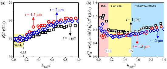 Figure 7 shows the variations in elastic modulus and indentation hardness calculated by the CACA method (i.e., Equations (10) and (11)) with relative indentation depths hmax/t, and the and of three AlCu thin films with different thicknesses show the same trend with hmax/t. Under small hmax/t (<0.15), can be approximated to be constant (i.e., = 58.9 GPa, 58.3 GPa and 59.4 for t = 1 µm, 1.5 µm and 2 µm films, respectively), which lies within the reasonable range. As anticipated, the elastic response of the films is independent of thickness [22]. Under large hmax/t (>0.15), increases with increasing hmax/t due to the substrate effects [64], since the observed rise follows the elastic modulus of the substrates. Under small hmax/t (<0.15), decreases with hmax/t due to the indentation size effect [65]; the constant values of (i.e., HCA IT = 0.75 GPa, 0.64 GPa and 0.63 GPa for t = 1 µm, 1.5 µm and 2 µm films, respectively) can be approximated for intermediate indentation depths (i.e., 0.15 < hmax/t < 0.5), and can be regarded as the ones without the influence of the substrate; increases with hmax/t due to the substrate effects under large hmax/t. The results indicate that the nanoindentation hardness values of soft films on hard substrates at intermediate indentation depths (i.e., 0.15 < hmax/t < 0.5 for AlCu films) can be accurately obtained by correcting the error of the elastic modulus caused by pile-up behavior, which is to be expected, as the plastic field under the indenter is a short-range field compared to the elastic field [20,64].