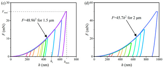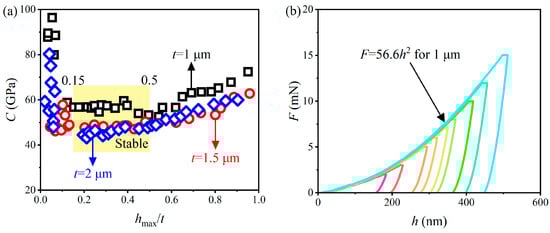 The maximum indentation depth is maintained within the AlCu film thickness of 15–50% to avoid the poor fit of the curvature C data by Kick’s law under small hmax/t (<0.15) and the effect of Si substrate under large hmax/t (>0.5), as shown in Figure 8d. Figure 8b–d shows the indentation load F-displacement h curves of three AlCu films at different Fmax, and the hysteresis phenomenon between the loading and unloading curves indicates that the AlCu film undergoes elastic–plastic deformation during nanoindentation. The smooth loading and unloading curves indicate no cracks or fractures in the AlCu film during nanoindentation [66,67]. The loading curves under different loads follow the same trace, indicating the good repeatability of the nanoindentation experiment. The loading curves of thin films with different thicknesses reflect the ability of the films to resist external deformation. Under the same load, it can be seen that hmax of 1 μm AlCu film is the smallest, hmax of 1.5 μm AlCu film is in the middle, and hmax of 2 μm AlCu film is the largest, indicating that the ability of AlCu films to resist external deformation decreases with increasing t. The average value of C decreases with an increase in the film thickness t by 0.15 < hmax/t < 0.5, and the average value C of three AlCu films is listed in Table 2.