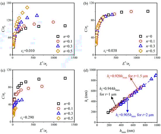 Variation in C/σr with E*/σr for 2 µm AlCu film at different n and εr: (a) εr = 0.010, (b) εr = 0.038, and (c) εr = 0.290; and (d) the relationships between hr and hmax for 0.15 < hmax/t < 0.5.
