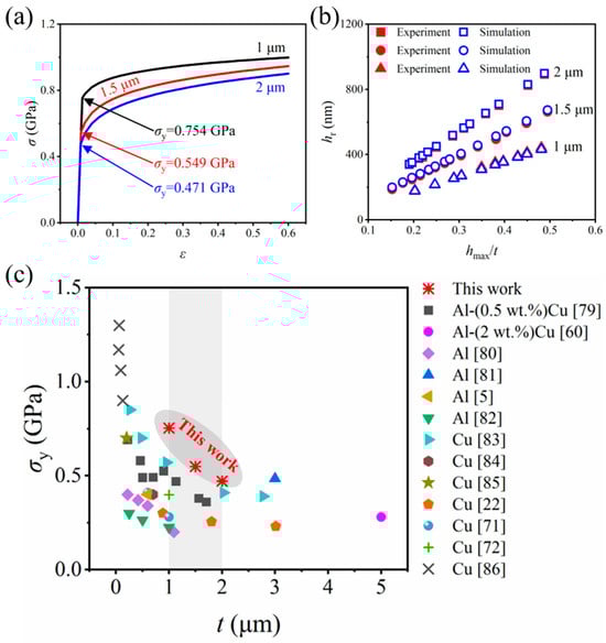 The results and validation of σy obtained by the nanoindentation reverse method for Al-(4 wt.%)Cu films with different thicknesses: (a) stress–strain curves; (b) the comparison of hr between simulation and experimental results; (c) the comparison of σy between this work and that reported by various methods in the literature: Macionczyk [79], Nix [60], Doerner [80], Cai [81], Yeo [5], Stone [82], Yu [83], Hommel [84], Balk [85], Gouldstone [22], Keller [71], Flinn [72], and Zhang [86].