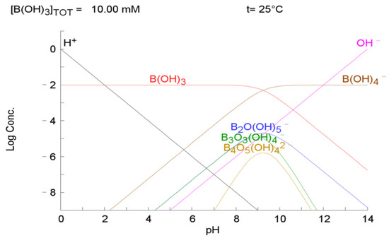 The morphological distribution of boron in an aqueous solution in 10 mM B(OH)3 is shown in Figure 1, which was obtained through a chemical equilibrium diagram (software, Eq-Diagr-Java 7, Chemical Equilibrium Calculations software). Boron exists in the form of negative ion groups and consists mainly of B(OH)4− ions in an alkaline region of more than pH 9.
