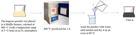 The preparation method for biochar using sugarcane bagasse is shown in Figure 2. The dried sugarcane bagasse powder was placed in a muffle furnace, calcined at 400 °C (with a temperature ramp of 10 °C/min) in an N2 atmosphere, and pyrolyzed for 1 h, after which it was washed and dried to obtain char A.
