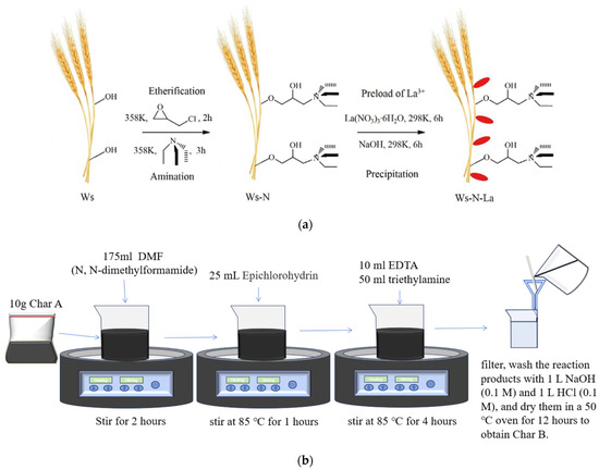 Figure 3 shows the preparation method for char B. First, 10 g of dried char A was mixed with 175 mL of N,N-dimethylformamide (DMF) at ambient temperature for 2 h; then, 25 mL epichlorohydrin was added to the mixture as an agent and it was stirred for etherification for 1 h at 85 °C, followed by the slow addition of 10 mL of EDTA and 50 mL of triethylamine to graft quaternary ammonium groups on char A. The solution was stirred for 4 h at 85 °C and then filtered, and the reaction product was washed with 1 L of NaOH (0.1 M), 1 L of HCl (0.1 M), and 1 L of 50% ethanol solution and then dried in an oven at 50 °C for 12 h to obtain char B. The reaction is shown in Figure 3a [63].