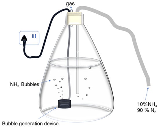The preparation method for NH3 with N2 nanobubbles is shown in Figure 4. The nanobubbles were prepared in 1 L of deionized water in a 2 L conical flask, which was placed in an ultrasonic atomization equipment bubble generator (Dongguan Run Yang Electronic Co., Ltd., Dongguan, China) and a gas flow device. A mixture of 10% NH3 and 90% N2 was introduced as the gas. After five minutes of aeration, the bubble generator was turned on to prepare the bubbles, during which the gas was continuously aired. After 20 min, the valve and bubble generator were closed. Then, an aqueous solution with ammonia nanobubbles could be collected in the water. The ammonia gas reaction is shown in the following Equations (2) and (3) [64].
