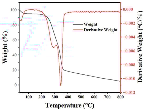 Thermogravimetric analysis (TGA) was performed to confirm the temperature of biochar preparation. The TGA and DTG curves of sugarcane bagasse under a N2 air atmosphere at a heating rate of 5 °C min−1 are shown in Figure 5. The TGA curve (the black line in Figure 5) of sugarcane bagasse showed the first weight loss interval between 30 °C and 150 °C, which might have resulted from the vaporization of water and other volatile compounds. Meanwhile, between 150 °C and 364 °C, another region of weight loss was observed, which resulted from the expulsion of organic compounds such as fats, waxes, alkaloids, and terpenes. In addition to these two losses, a third region of weight loss was associated with the thermal degradation of lignin, hemicellulose, and cellulose, and the decarboxylation reactions formed carbon, ketones, and aldehydes, occurring between 364 °C and 800 °C [65,66,67]. The DTG curve (the first derivative of TGA, the red line in Figure 5) of sugarcane bagasse showed a peak at 346 °C, corresponding to the maximum rate of mass loss related to the thermal decomposition of cellulose. A shoulder at 293 °C was associated with the thermal decomposition of the hemicellulose [68]. In this study, a temperature of 400 °C was used to prepare char with sugarcane bagasse.