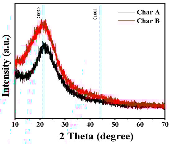 The X-ray diffraction spectra obtained for char A and char B are shown in Figure 6. The broad characteristic peak at 2 theta (θ) = 21.9° was ascribed to the (002) plane of graphite microcrystals in amorphous carbon. For char B, the (002) peak moved towards more left 2θ angles than char A. This result indicated that favorable defects could be formed in the prepared char B. On the other hand, the peak at 2θ = 43.8° is considered the (100) plane of the graphitic structure [69,70,71,72]. However, the (100) peak did not appear in the XRD patterns for chars A and B. The chars A and char B prepared at 400 °C did not reach the crystallization temperature of the graphitic structure.