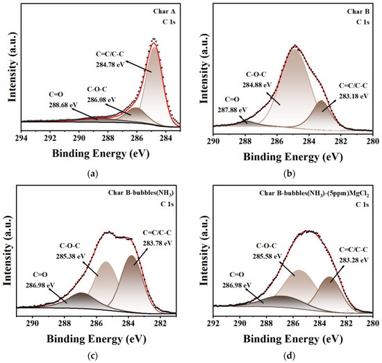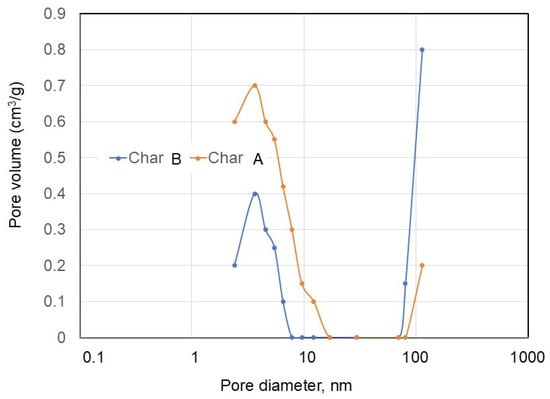 The surface areas of char A and char B were analyzed based on the N2 adsorption–desorption isotherms obtained using multipoint BET analysis, and the total pore volume and pore diameter were determined using the BJH method. They are listed in Table 1, and the pore size distribution depending on the pore diameter is shown in Figure 8. It was observed that char A had a surface area of 42.56 m2/g, and char B had a surface area of 1.59 m2/g. Char A’s surface area was larger than that of char B. However, when comparing the pore diameters of char A and char B, that of char A was smaller than that of char B. Char A was a microporous material and char B was a mesoporous material [73,74].