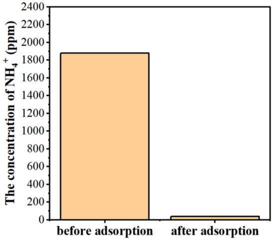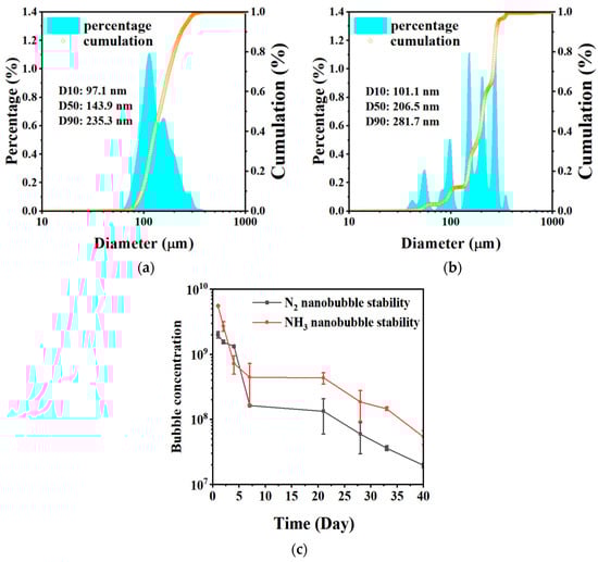 The changes in the concentrations of NH3 nanobubbles at pH 11.2 and N2 nanobubbles at pH 10.4, depending on time, are shown in Figure 9c. The particle size distributions shown in Figure 9a,b were measured on the initial preparation day, and the particle concentrations were 5.6 × 109 particles/mL for NH3 nanobubbles and 2.0 × 109 particles/mL for N2 nanobubbles. Both particle concentrations decreased rapidly over a period of five days and gradually decreased after the fifth day, as shown in Figure 9c. During this period, the particle concentration of NH3 nanobubbles was higher than that of N2 nanobubbles almost every time. As the nanobubbles have a large specific surface area, there is the possibility for a large amount of ion adsorption under optimal conditions.