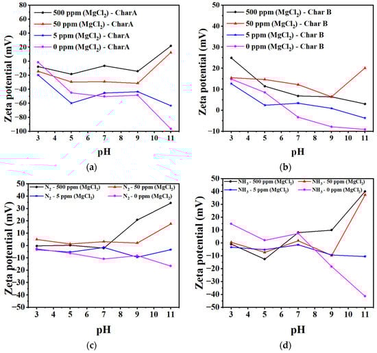 Zeta potential as a function of pH for adsorbents and nanobubbles. Zeta potential in MgCl2 solutions of different concentrations of char A (a); char B (b). Zeta potential in MgCl2 solutions of different concentrations of N2 nanobubbles (c) and NH3 nanobubbles (d).
