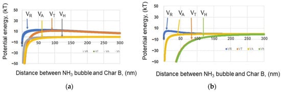 The interaction between the NH3 nanobubbles and char B was estimated using the extended DLVO theory [59]. The total potential energy (VT), van der Waals interaction energy (VA), hydrophobic interaction energy (VH), and electrostatic interaction energy (VE) between NH3 nanobubbles and char B are shown in Figure 11. If there is no addition of MgCl2, there is an approximately 10 kT barrier of total potential energy (VT) between the NH3 nanobubbles and char B, as shown in Figure 11a. The coagulation possibility between NH3 nanobubbles and char B is low. On the other hand, when adding 5 ppm MgCl2 in 200 ppm B aqueous solution, there is no total potential energy barrier, as shown in Figure 11b. Therefore, the NH3 nanobubbles and char B will coagulate easily.