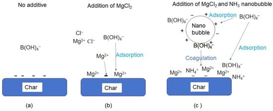 The boron adsorption types are shown in Figure 12. If there are no additives in the boron-containing aqueous solution, B(OH)4− anions, shown in Figure 1 in an alkaline region, cannot adsorb on the negatively charged char, as shown in Figure 12a. When MgCl2 is added to the solution, the negatively charged char adsorbs Mg2+ ions, and the surface charge becomes positive. Therefore, B(OH)4− can be adsorbed on the positive surface of the char, as shown in Figure 12b. The interactions between the nanobubbles and char when both NH3 nanobubbles and MgCl2 are added to the solution are shown in Figure 12c. The Mg2+ ions are adsorbed on the negative nanobubble surface and char. B(OH)4− ions can be adsorbed at the positive site of the NH3 nanobubbles and char. In particular, the nanobubble’s specific surface area is very large, and there are a large number of nanobubbles—approximately 109—after a few days, as shown in Figure 9. When the boron-adsorbed NH3 nanobubbles and boron-adsorbed char coagulate, a large amount of B(OH)4− will be removed from the aqueous solution. As shown in Figure 11b, the B(OH)4−-adsorbed NH3 nanobubbles can coagulate with the B(OH)4−-adsorbed char B with 5 ppm MgCl2 at pH 9, as there is no potential barrier between the nanobubbles and char. An additional 5 ppm MgCl2 was employed while considering the drinking water quality standards [60].