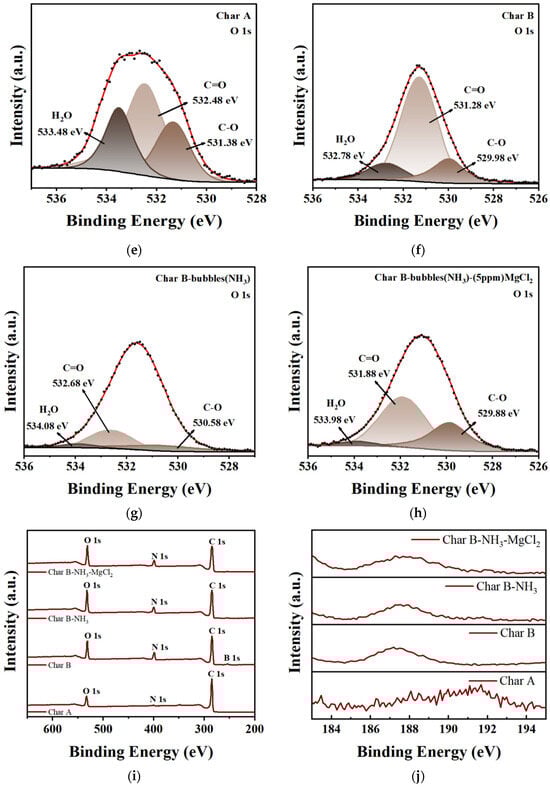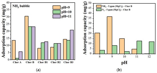 The effect of the pH on the boron adsorption of the adsorbents with 5 ppm of MgCl2 aqueous solution is shown in Figure 13a. As the pH rose, the boron adsorption capacity of the adsorbents increased; it peaked at pH 9 and then decreased with a further increase in the pH. Char B–MgCl2 (5 ppm)–NH3 nanobubbles resulted in the highest boron adsorption capacity and reached a maximum of 35.5 mg/g at pH 9. The zeta potential of char A was negative at −40 to −60 mV from pH 9 to 11 with 5 ppm MgCl2 in the solution, as shown in Figure 10a. The B(OH)4− ions were difficult to adsorb on the negative surface of char A. Meanwhile, the zeta potential of char B was positive at +3 mV at pH 9 with 5 ppm MgCl2 in the solution, as shown in Figure 10b, and the B(OH) 4− ions could adsorb on the positive surface of char B. When increasing the pH from 9 to 11, the zeta potential of char B became slightly negative, and the boron adsorption amount on char B decreased. The zeta potentials of chars B1, B2, and B3 were slightly negative from pH 9 to 11 with 5 ppm MgCl2. The adsorption rate of B(OH)4− ions was not high. When the pH changed in the alkaline area, the zeta potential became high with a negative charge and boron desorption became possible, as well as its regeneration.