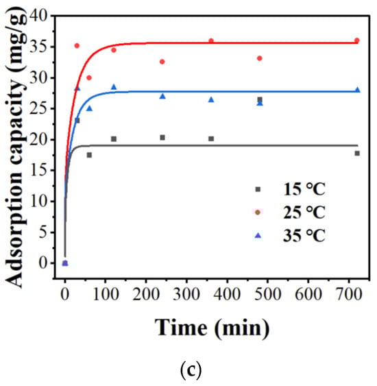 We studied the effects of different contact time and temperatures on the adsorption of char B–MgCl2 (5 ppm)–NH3 nanobubbles. As shown in Figure 13c, the boron uptake increased with time and reached 35 mg/g at the temperature of 25 °C. Compared with the adsorption in an aqueous solution at 15 °C and 35 °C, the adsorption efficiency of boron at 25 °C was improved to 75.0% in the solution.