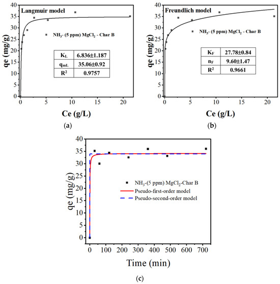 Boron adsorption isotherm and kinetics for char B with 5 ppm MgCl2 and NH3 nanobubbles at pH 9 (adsorbent mass/volume of solution (m/V) is 0.4 g/L, measured temperature is 298 K, adsorption time is 2 h). (a) Langmuir adsorption isotherm, (b) Freundlich adsorption isotherm, (c) effect of adsorption capacity depending on time.