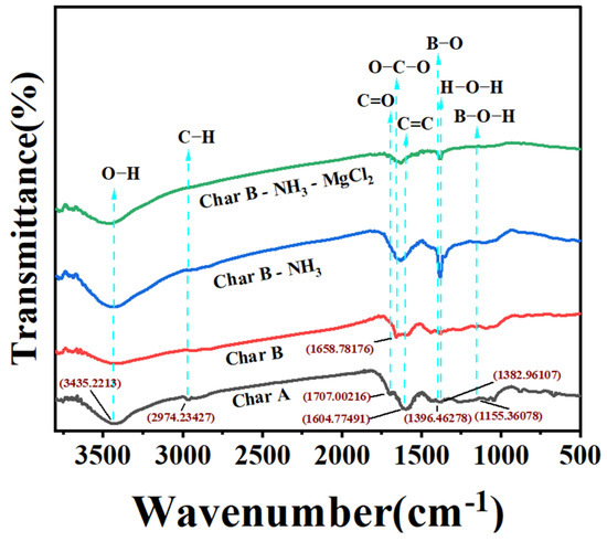 On the other hand, each reagent was used to prepare modified char A to investigate the adsorption effect of the reagent. First, 10 g of dried char A was mixed with 200 mL of N,N-dimethylformamide (DMF) in an 85 °C water bath and stirred for 5 h. Then, it was filtered, washed, and dried using the same method shown in Figure 3 to obtain char B1.