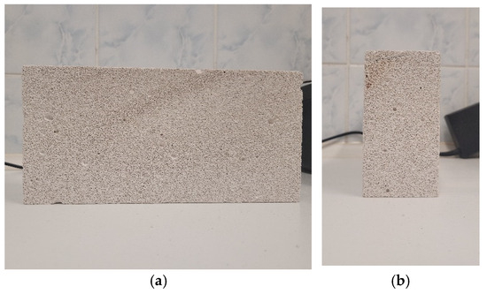 The study was carried out on cuboid AAC blocks with a density equal to 400 kg/m3. The adopted assumption was that the AAC is anisotropic as a result of the material expansion and curing process during material production. Aerated concrete is produced from quartz sand, acting as a microaggregate alongside cement, lime, gypsum, aluminum powder, and water. The most important stage in the production of aerated concrete is its growth and maturation. An important role in these processes is played by aluminum powder, which causes the mass to grow in the appropriate conditions at a high pH of the mixture, which is ensured by the presence of calcium hydroxide. In the reaction of aluminum powder with calcium hydroxide, hydrogen is released, which causes the mass to grow, as a result of which gas bubbles occur in the structure of the material mixture, which consequently creates a foamy mixture growing in the vertical direction. The hydrogen then escapes and is replaced by air, which fills the empty spaces of the aerated concrete. That is why the pore shape differs for perpendicular and parallel directions in material specimens depending on the expansion process. During expansion and curing, therefore, the processes of moisture migration, as well as thermal parameters, may vary. Hence, the considered samples were cut in both directions, i.e., along and perpendicular to the expansion and curing direction. Samples perpendicular to the expansion and curing direction are marked as H (horizontal direction), and samples parallel to the expansion and curing process are marked as V (vertical). The sample images were taken at a fixed distance using the same settings of the camera.