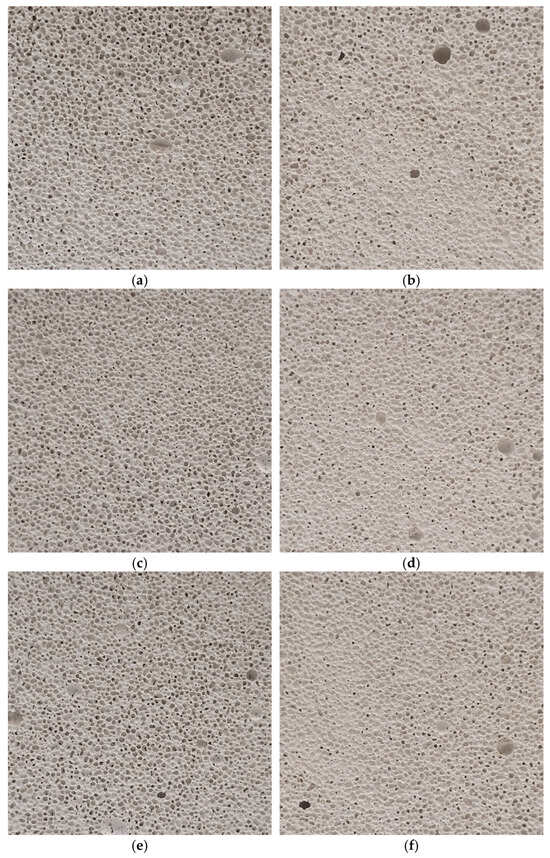 High-resolution images of AAC samples were acquired using a fixed camera setup to ensure consistency in pixel size and resolution across all images. The images were taken for four samples in both vertical (V) and horizontal (H) orientations corresponding to the expansion and curing directions of the concrete blocks, as shown in Figure 1. Each image was trimmed to 2300 × 2300 pixels to eliminate edge effects and to maintain uniformity across the different samples. This made it possible to enlarge the test sample relative to that in [41]. In addition, the study was performed for four different samples. Figure 2 shows all the resulting images used subsequently for analysis.