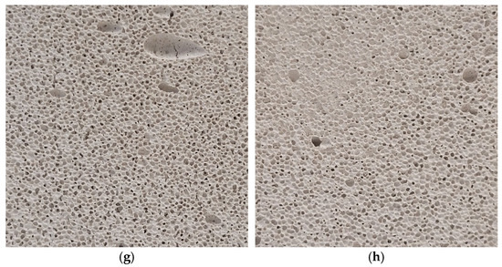 (a–h) Images were cropped to 2300 × 2300 px. The cross-section along the expansion and curing direction and perpendicular to expansion and curing direction are shown on the left-hand and right-hand side, respectively, for all four samples in sequence.