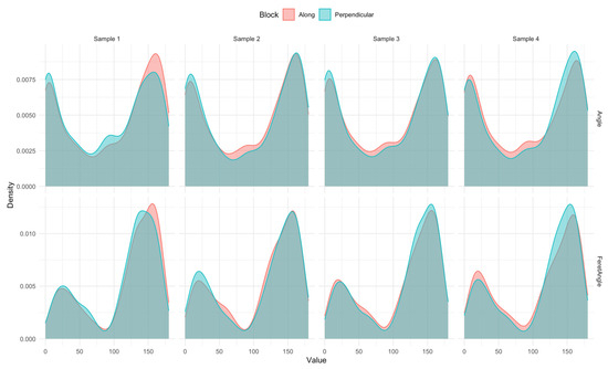Distributions of angle and Feret angle variables by block setting for all four samples.