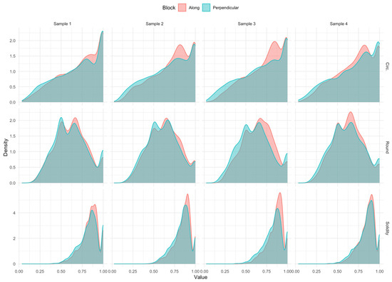 The number of pores in samples used for comparative analysis was above 3000 for the sample along the growth direction, as well as perpendicular (see Table 4). The distribution of variables was examined first. As far as the shape is concerned, there are similarities in distribution. However, the intensity of observations is different depending on the block direction. Figure 5 and Figure 6 show the distribution. Figure 5 presents the densities of the metrics for the pore slope; here, the differences do not appear significant except for sample 1. Figure 6 shows the metrics for assessing the pore roundness. The solidity metric significantly distinguishes the direction in all four samples.