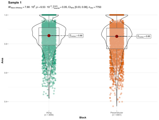Among these metrics, what significantly distinguishes the cross-section are also measures of the pore stretch length, major, minor, Feret and MinFeret, and area. The result of the median equality test for the area variable is presented in Figure 7. Figure 8, in turn, presents the median equality test for the solidity variable.