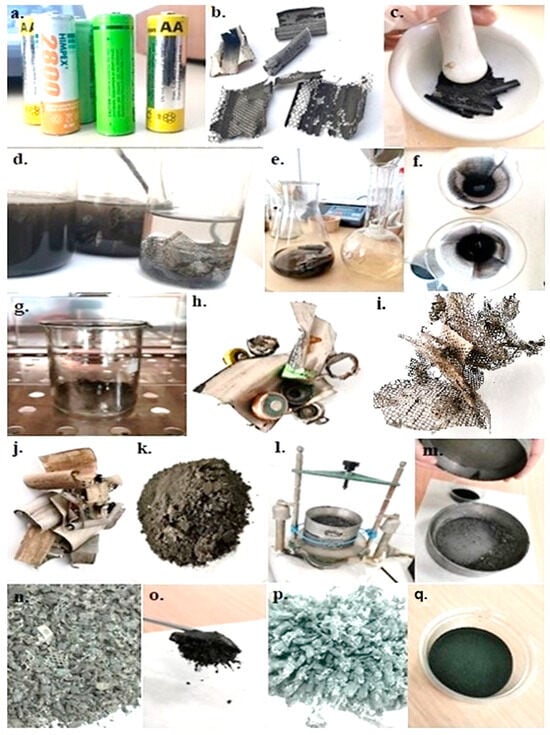 Processing of Ni-MH batteries: (a) before dismantling, (b) after dismantling, (c) crushing the mixed material, (d) washing with distilled water, (e,f) the filtration process, (g) oven drying the powder, (h) metallic casings, (i) grids, (j) non-metallic fraction after drying, (k) powder after oven drying, (l,m) sieving, (n) the coarse product obtained after sieving (mixture of pieces of metal grids with mixed content and non-metallic fraction), (o) magnetic separation, (p) pieces of magnetically extracted metal grids, (q) final powder.