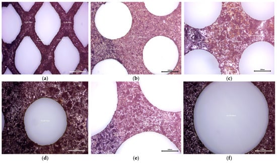 The metal grids used as anodes in Ni-MH batteries have different shapes and mesh sizes, as can be seen in Figure 2. The T1 and T2 types maintain their dimensions and shapes over the entire surface—the rhombus shape for T1 (Figure 3a) and the round shape for T2 (Figure 3b); the same can not be said about T3, which is formed by two sections with different mesh sizes (Figure 3c,d—section with small mesh sizes and Figure 3e,f—section with larger mesh sizes).