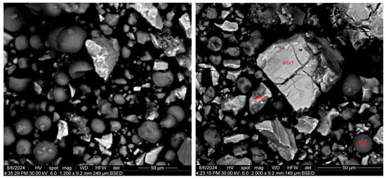 The morphological aspect of the black mass is shown in Figure 4. Round particles of different sizes, large aggregations of particles of different sizes, and smaller pieces broken from larger aggregates (irregular particles) can be observed, most likely being formed because of the electrochemical processes inside the battery during the charge–discharge cycles and the hydrogen intercalation into the lattices of strong hydride-forming elements (i.e., La, Ce, Pr, and Nd). During the continuous charge–discharge cycles inside the battery, the pulverization of both the anode and cathode material takes place, leading to phase transitions that amplify the degradation process.
