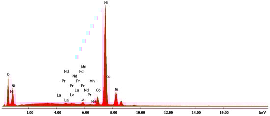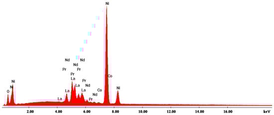 The EDX analysis in point 3—irregular particles—is the same as the other two previous analyses, namely that Ni is found in the highest concentration (approx. 52%). In addition to this, substantial amounts of La (16.3%), Ce (approx. 6.5%), Nd (3.2%), and Pr (approx. 2%) result from the analysis.