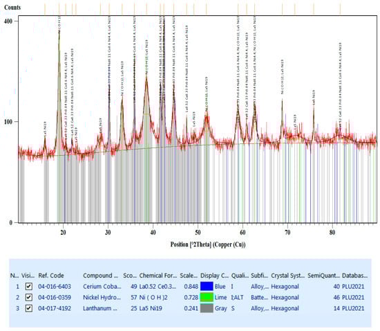 In addition to this phase, the typical compounds AB5 are also found, in our case the La0.52Ce0.33Pr0.04Nd0.11Co0.6Ni4.4 compound, where A is the rare earth element (REE) mixture of La (lanthanum), Ce (cerium), Pr (praseodymium), and Nd (neodymium), and B is a mixture of Ni (nickel) and Co (cobalt). The recovery of this compound without the separation of the REEs and its reuse in the production of new Ni-MH batteries or H-storage portables [33] will reduce the cost of recycling by drastically reducing the energy required and the processing time. In [34], a compound of the REE*MxNi5-x type was successfully produced using solution combustion methods followed by a reduction process. The compound crystallizes in the hexagonal system, space group P6/mmm. The REEs in the form of oxalates were recovered from used NiMH batteries through hydrometallurgical processes and used to synthesize an REE*MxNi5-x (where x = 0.4) hydrogen storage material [34].