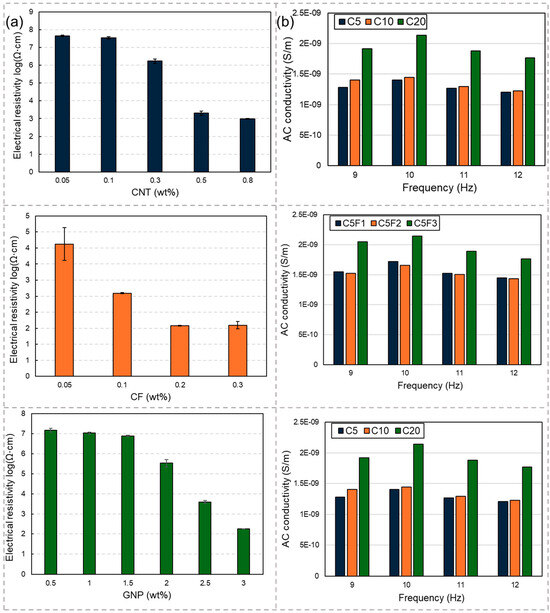 Electrical characteristics: (a) electrical resistivities of the samples incorporating solely CNTs, CFs, or GNPs; (b) AC conductivity of the samples in the X-band of the frequency range.