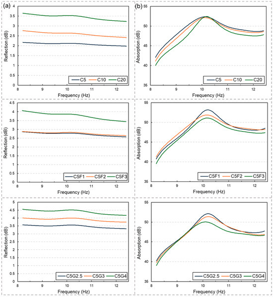 EMI shielding performance of the samples, expressed as (a) reflection and (b) absorption losses in the X-band of the frequency range.