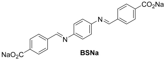 The synthesis of BSNa is shown in Scheme 1. First, a condensation reaction occurs between two equivalents of 4-formylbenzoic acid and one equivalent of p-phenylenediamine yielding the bisimine BSH. Subsequently, an ion exchange ensues, resulting in the formation of the sodium bisimine salt.