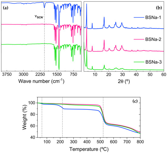 In the original synthesis, toluene was used as the solvent in the first step, heating for 24 h hours at 85 °C [18]. In the second step, triethylamine was employed as a base to facilitate the deprotonation of carboxylic acids, with sodium thiocyanate serving as the cation donor and acetonitrile as solvent, heating for 24 h at 45 °C. In 2024, Castillo-Martínez et al. [29] synthesized the potassium analog salts (BSK), using ethanol as the solvent in both steps at ambient temperature, thus through a more sustainable route. When attempting to reproduce the BSNa synthesis in this work, using the method for BSK, it was observed that it was difficult to remove the thiocyanate anion. The work-up involved centrifuging the resulting solid and washing with ethanol. After six washes, a prominent peak at 2058 cm−1 in the IR spectra, corresponding to the SCN stretching, was observed (Figure 2a). After seven additional ethanol washes, the intensity of the SCN stretching decreased significantly but it was still detectable. This is consistent with the results from the microanalysis conducted to determine the content of carbon, nitrogen, hydrogen, and sulfur. The results indicate that, excluding the contribution of oxygen and sodium atoms, the sulfur content decreased from 4.25% after six washes down to 0.3% after thirteen washes. This could be due to the formation of the by-product triethylammonium thiocyanate as proposed by López-Herraiz et al. [18].