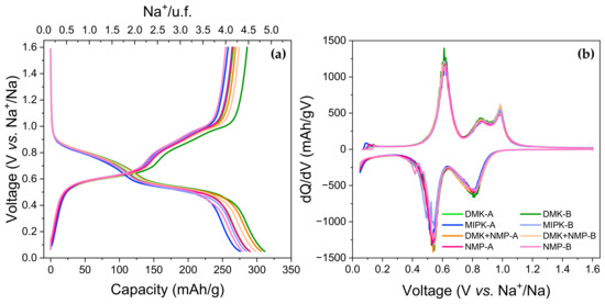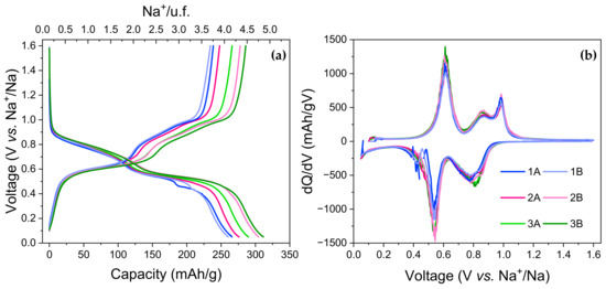 (a) Voltage vs. specific capacity and (b) voltage derivatives of the specific capacity vs. voltage for the second cycle at C/10 of BSNa-1 (1), BSNa-2 (2), and BSNa-3 (3). A and B are twin cells.
