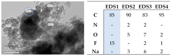 Another clear difference among laminates is the presence of spherical particles in the DMK and MIPK electrodes (Figure 6b,d). These particles are absent in the electrodes prepared with NMP and the DMK-NMP mixture (Figure 6f,h). EDX analysis (Figure 7) and elemental mapping (Figure S7) in the TEM reveal that these spherical particles (EDS 1 in Figure 7) are composed solely of fluorine and carbon, which suggests that the spherical particles are the PVDF-HFP copolymer, which also has spherical morphology (Figure S8). The polymeric binder distribution is, thus, uneven in the DMK and MIPK laminates. In contrast, it appears uniform in the DMK-NMP and NMP laminates, suggesting that NMP promotes a more homogenous polymer distribution throughout the laminate. This uneven distribution may be linked to the increased cracking and poor adherence observed in the DMK and MIPK laminates. Since PVDF-HFP is highly soluble in both DMK and MIPK, more so than in NMP, the uneven polymer distribution is not likely due to solubility issues, and its presence is quite intriguing.