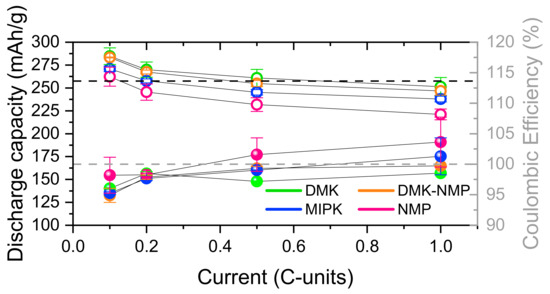 As shown in Table 4, the specific capacities obtained from laminates processed with DMK and DMK-NMP are slightly higher than those obtained with MIPK and NMP. This suggests the potential to either substitute NMP with DMK, but its implementation seems challenging due to high-speed evaporation or reduced usage (as in DMK-NMP) in electrode processing. These alternatives are more sustainable, less toxic, and have lower boiling points, leading also to significantly decreased energy costs during the solvent evaporation step. However, for DMK laminates, further research is needed to minimize cracking and improve manageability. The DMK-NMP laminate, which reduces NMP content to 10% (v/v), emerges as a favorable option due to its high capacity, rate performance, and ease of handling during processing.