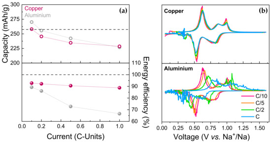 Figure 10a presents the energy efficiency of BSNa cells utilizing either copper or aluminum as the current collector. The energy efficiency was calculated as the ratio of energy discharged by the battery to the energy charged into the battery. For these calculations, hypothetical full cells were considered, wherein the positive electrode is a commercial layered oxide NaNi1-x-y-zMxM′yM″zO2 from Faradion company [34]. This cathode material has a specific capacity of 165 mAh/g and operates at an average voltage of 3.2 V. In this analysis, it is assumed that the average charge and discharge voltages of the cathode are identical, and that changes in the specific energy are only due to differences in the anode voltage polarization and reversible capacity.