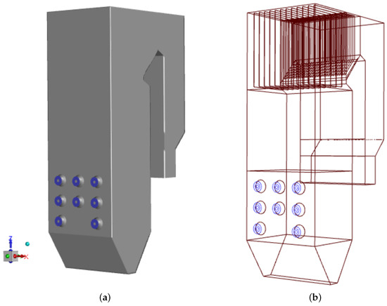 Geometrical model of the studied OP-230 type boiler: the general view with the front wall showing the burners’ system (blue circles) (a) and the first-pass details with superheater (b).